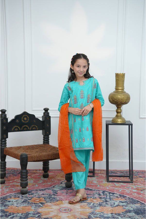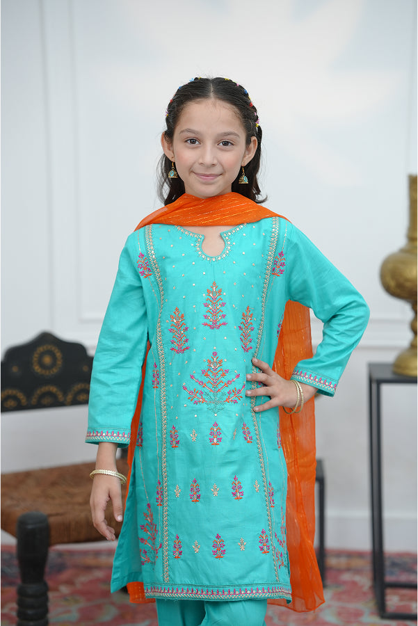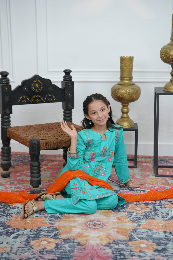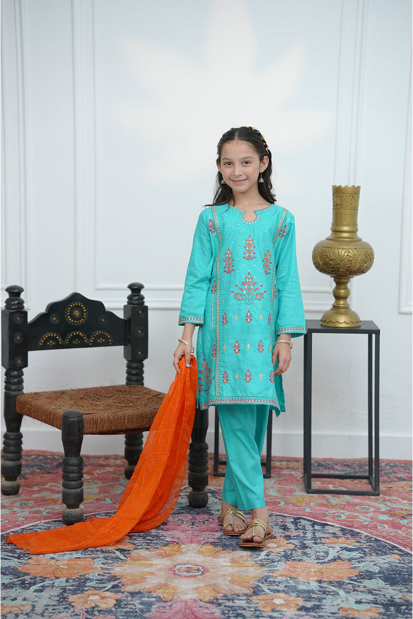 Computer embroidery work 3 piece suit shirt & trouser with chiffon dupatta